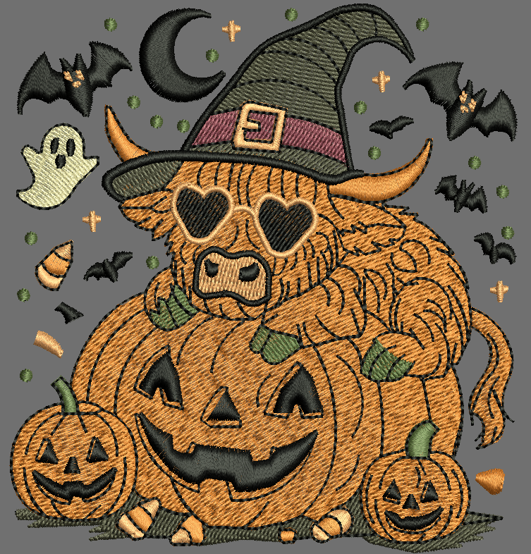 A festive Halloween-themed embroidery design featuring a highland cow dressed in a witch hat, surrounded by carved pumpkins, bats, a ghost, and candy. Perfect for Halloween apparel, bags, or home décor. This detailed and playful design adds a fun spooky touch to any fabric project.
