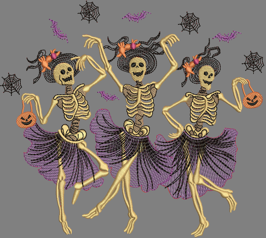 Get into the spooky spirit with this fun and festive “Halloween Skulls” embroidery design! Featuring three dancing skeletons dressed in purple hula skirts, surrounded by Halloween-themed elements like spider webs, bats, pumpkins, and swirling accents, this design brings a playful twist to the traditional creepy season.